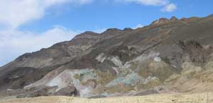 ![]() Various mineral pigments have painted these volcanic deposits. Iron salts produce the reds, pinks and yellows. Decomposing mica causes the green. Manganese supplies the purple. Colors on the "Palette" are reproduced in a larger scale on the mountains around death valley. |