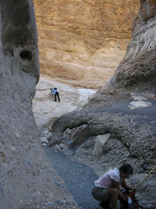 ![]() Denis is inspecting rock that has turned into smooth marble. Polished marble walls and odd mosaic patterns make up this canyon. Parts are so narrow that you have to walk single file. |