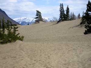 Carcross Desert is known as the smallest desert in the world. This area was originally covered by a large glacial lake. As the glaciers retreated, causing lower water levels, sandy lake bottom material was left behind. Strong prevailing winds from Lake Bennett have constantly worked this sand, making it difficult for vegetation to become established. Species of plants that have survived include Lodgepole Pine and Kinnikinnick. |