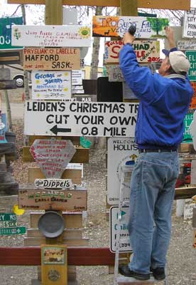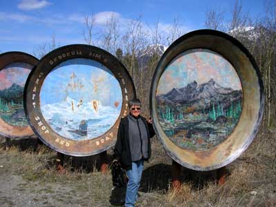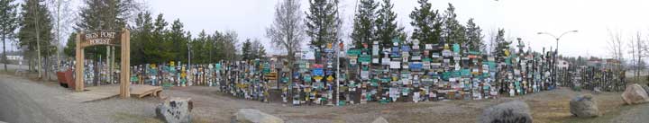 It was unbelievable to see. Watson Lake's famous collection of signs started in 1942 by Carl Lindley, a homesick highway construction worker. He erected a sign pointing to his home town of Danville, IL. The cluster of sign has been reorganized and new signs are added to the collection each year. What you see is only the front row... there are many more rows of posts behind these. The town of Watson Lake maintains the grounds.1991 had 12,000 signs, 2004 - 54,000 signs and today we added our sign to it. |