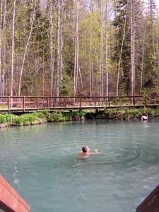 Alpha Pool Hot Spring (The main pool) The source waters of this Pool are 53 degrees Centigrade, and have the strong smell of sulphur and it bubbles out of the ground at the bottom of the picture to the left. Pool water mixed with the cooler spring waters produce pleasant temperatures ranging from 40 to 49 degrees C. It was only about 3-4 feet deep with 3 sections ranging from warm to medium to hot. You had to stir up the water as sometimes it got too hot. The bottom had small round stones, great for a foot message. This was also the site of a major construction camp for the AH. The natural hot springs were used by the troops daily, although once a week they cleared out, leaving the hot springs to the women of the camp. We enjoyed going in twice a day and then sat by the campfire. It's a hard life. Below is another Hot Spring which is very deep and has an even temperature. It was actually a much more comfortable temperature but the bottom was silt! |