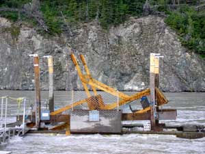 A fish-wheel. The wheel turns like a wind mill being pushed by