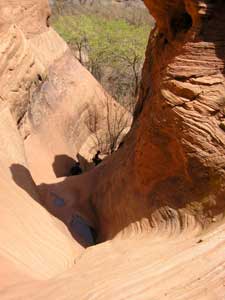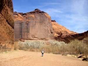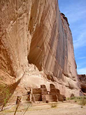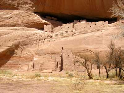 | Thursday, April 6, 2006. We are now in Navajo Country at Canyon de Chelly. We were so happy that for once we did not have to pay to stay in this park. Another thing different about this park is that the Navajo are still living here, since this is in their reservation. There are a lot of ruins here dating as far back as 300 to 1200 A.D.. We cannot see them up close unless we hire a guide and go down the canyon. We can see one ruin on the 1 1/2 mile walk down the canyon. Since we blew too much money at the Grand Canyon, we will not be hiring a guide. |