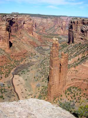 ![]() Spider Rock, name after Spider Woman. A Navajo folklore said to have shown women how to weave. This is one of their holy places. This rock powers 800 feet in this canyon which also has farmer's fields. |